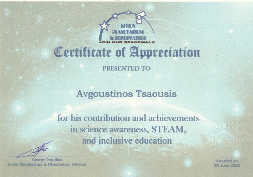 On October 5th and 6th, I had the incredible opportunity to serve as a mentor at the NASA International Space Apps Challenge. The four student teams that participated were remarkable, and the entire experience left me in awe. I want to thank the KITION PLANETARIUM OBSERVATORY for giving me the opportunity, the IMS Private School for hosting this event, and the Rotary Club of Limassol-Berengaria Cosmopolitan for supporting the project.